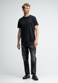 Jonge man met krullend haar die een effen zwart T-shirt met korte mouwen en een donkere spijkerbroek draagt, staand tegen een witte achtergrond.