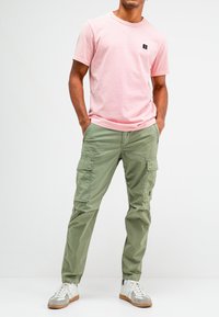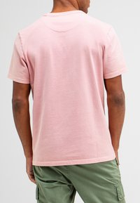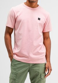 Lichtroze crew neck t-shirt van zachte katoen. Bevat een klein zwart logopatch op de linkerborst. Korte mouwen, comfortabele pasvorm.