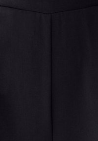 Turkooizen jumpsuit met kapmouwen, een gedefinieerde taille en wijde pijpen. Voorzien van zijzakken en een gladde textuur. Gecombineerd met een gevlochten handtas.
