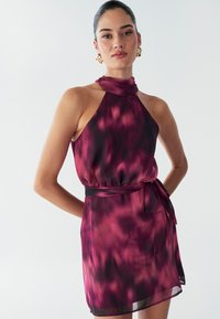 Halternekjurk in een gradient van dieproze en zwart. Gemaakt van vloeiende stof, met een strikceintuur en een doorschijnende rokoverlay.