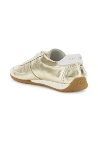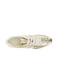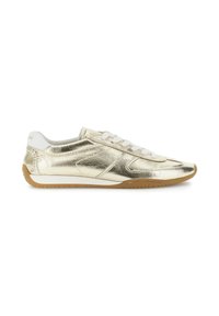 Lage metallic gouden sneaker met witte veters, witte hieltab en lichtbruine rubberen zool, getoond in profielzicht.