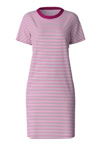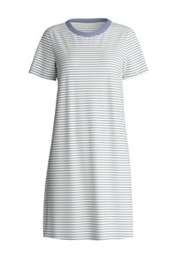 Jonge vrouw die blootsvoets staat en een witte jurk draagt tot op de knie met korte mouwen en dunne blauwe horizontale strepen.