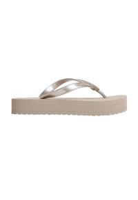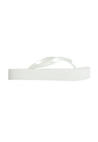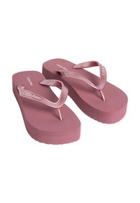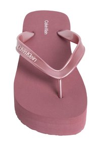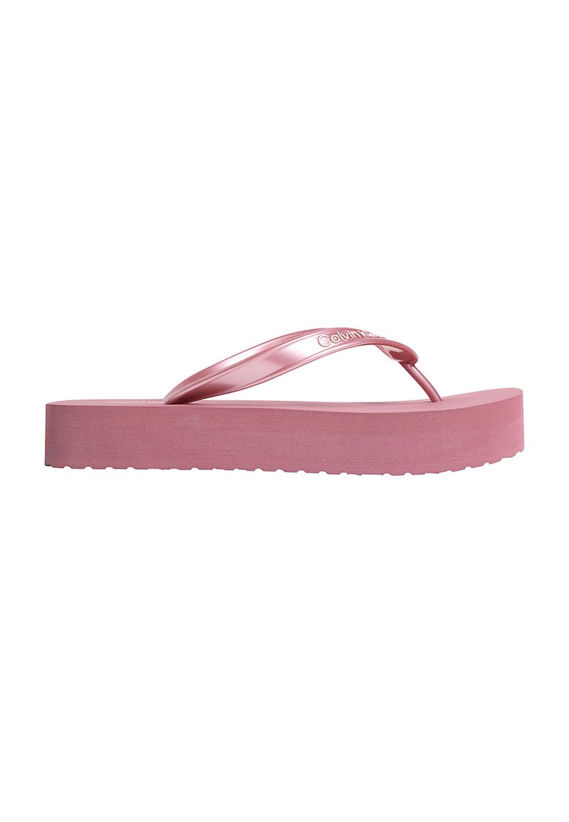 Roze platform flip-flop sandaal met dikke zool en glanzende bandjes, Calvin Klein logo op het bandje, zijaanzicht.