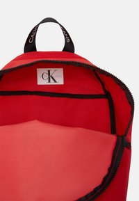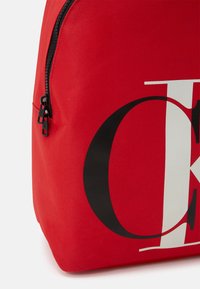 Rode stoffen rugzak met een afgeronde vorm, voorzien van een groot zwart-wit "CK"-logo, ritssluiting en een zwart handvat bovenop.