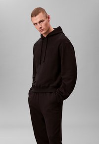 Zwarte hoodie en joggingbroek set, gemaakt van katoen, met een voorzak, trekkoorden en elastische manchetten voor een aangesloten look. Blootvoets.
