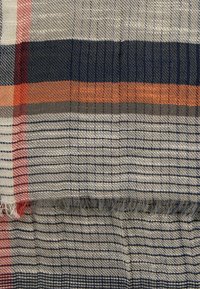 Licht stoffen sjaal met horizontale en verticale strepen in marineblauw, oranje, beige en roze, losjes omgeslagen met franjes aan de randen.