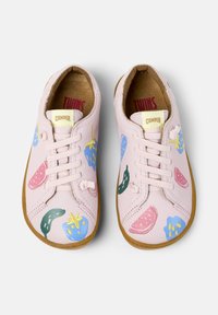 Roze lederen schoen met fruitontwerpen (aardbei, banaan) in blauw, geel en rood; met een tankleurige rubberen zool en veterluiting.