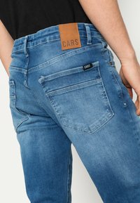 Lichtblauwe denim jeans met een slim fit, voorzien van contrasterende stiksels, een sluiting met een knoop aan de voorkant en twee achterzakken.