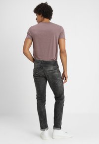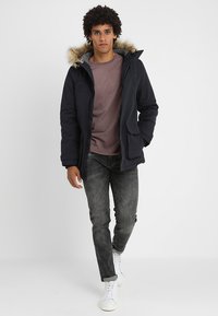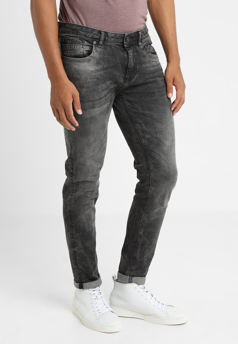 Zwarte denim jeans met een vervaagde afwerking, voorzien van een slim fit, zakken en stiksel details. Combinatie met witte high-top sneakers.
