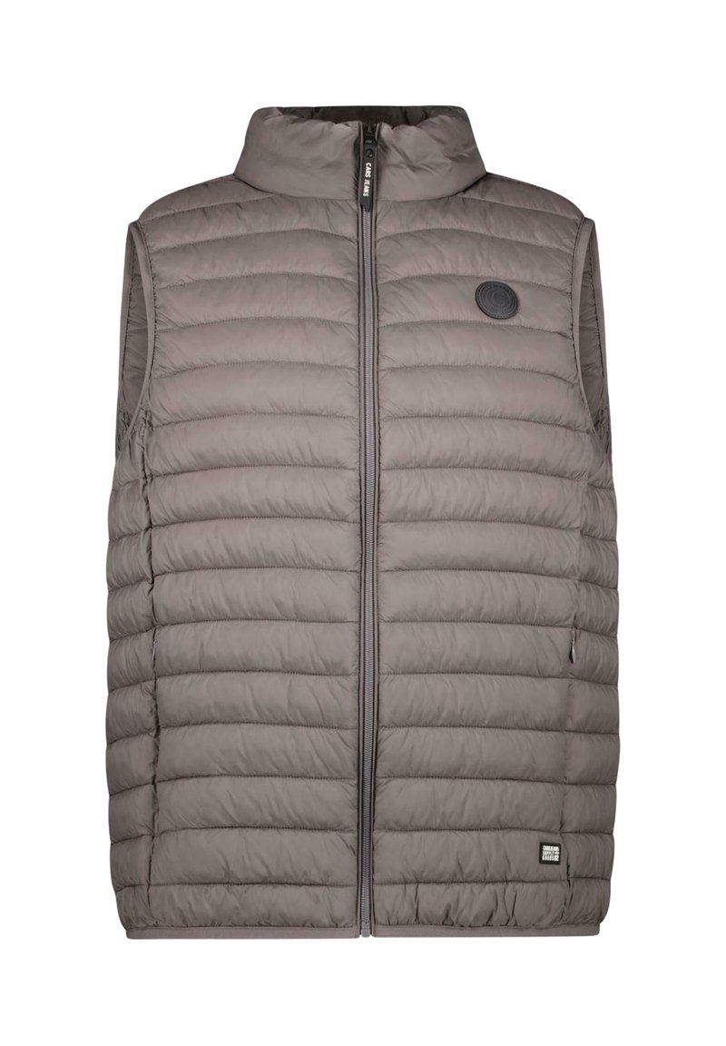Lichtgrijs, gewatteerd, mouwloos vest met een voorrits en een hoge kraag, voorzien van een klein rond logo op de borst en een rechthoekig label bij de zoom.