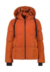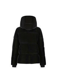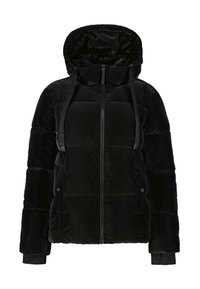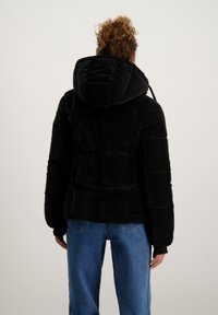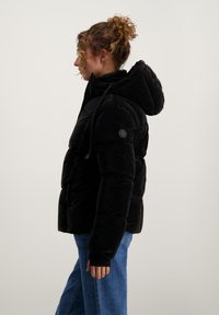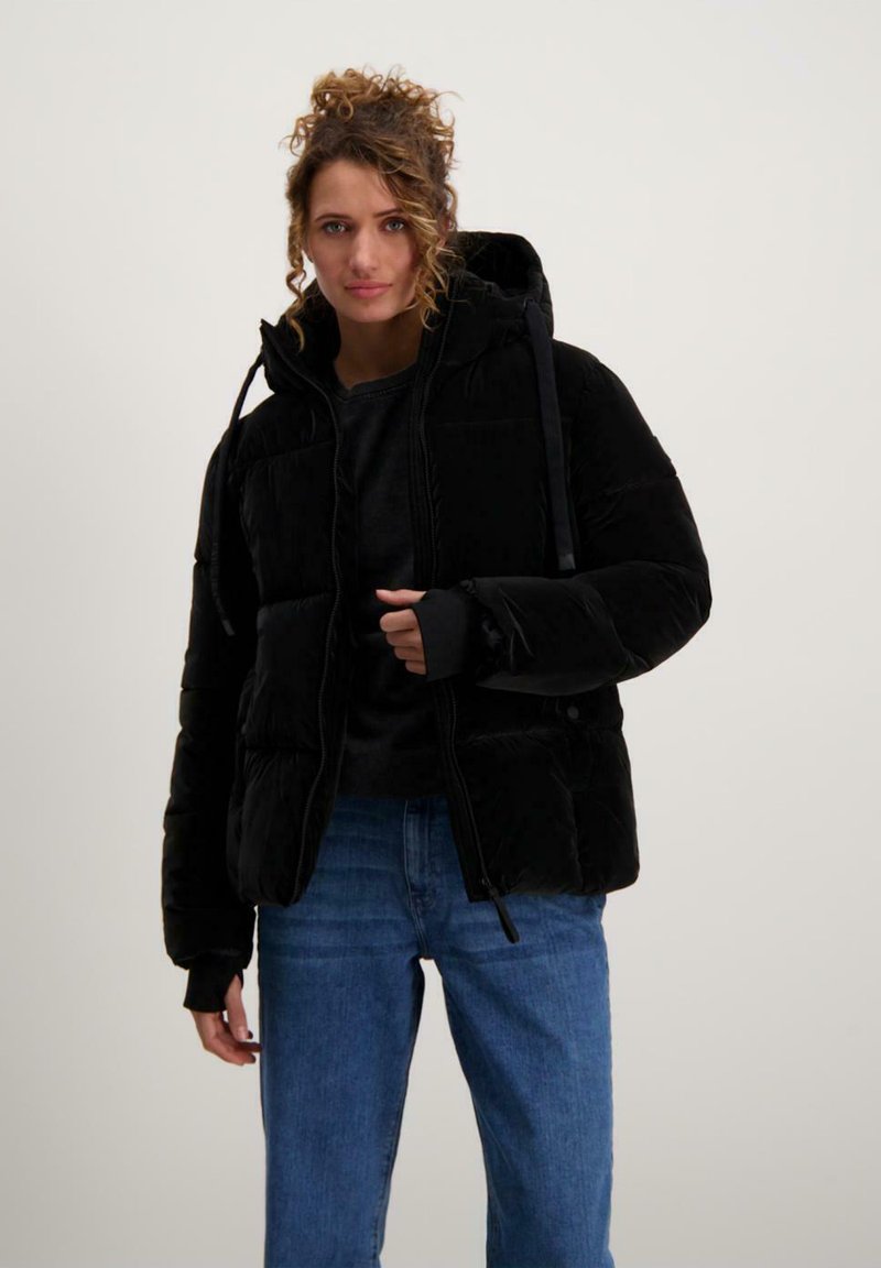 Zwarte pufferjack met een capuchon, ritsluiting en zijzakken. Beschikt over elastische mouwen en een matte afwerking. G gedragen over een donker top en blauwe jeans.