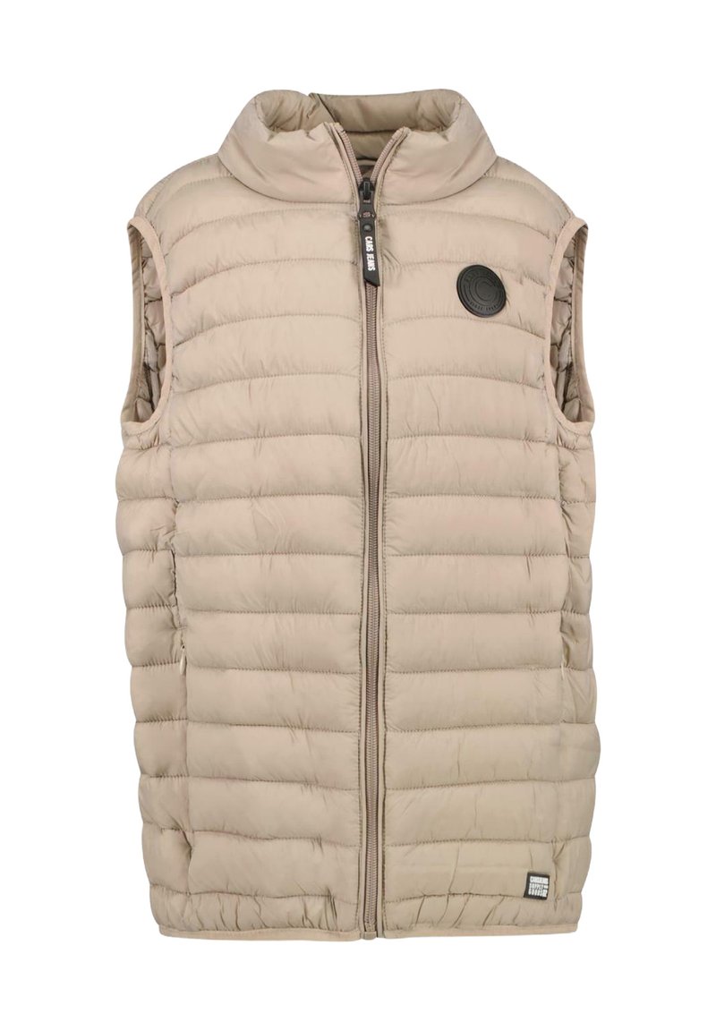 Beige mouwloze puffer vest met een hoge kraag, horizontaal gestikt patroon, ritssluiting aan de voorkant, zijzakken en een cirkelvormig logo patch.