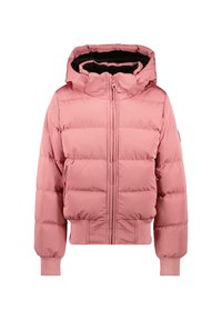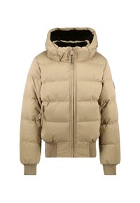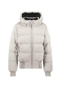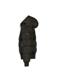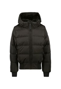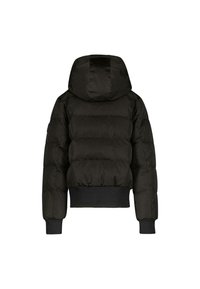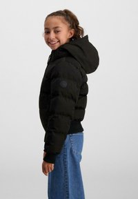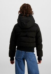Zwarte pufferjack met een capuchon, voorzien van een ritssluiting, geribde manchetten en een cropped ontwerp. Soepele textuur met gestikte patroondetails.