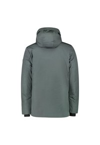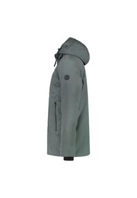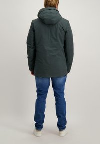 Donkergroene jas met capuchon, ritsluiting en zijzakken. Draagt bij blauwe jeans en witte sneakers, tegen een lichte achtergrond.