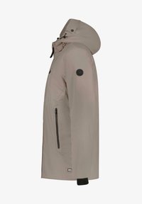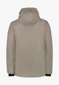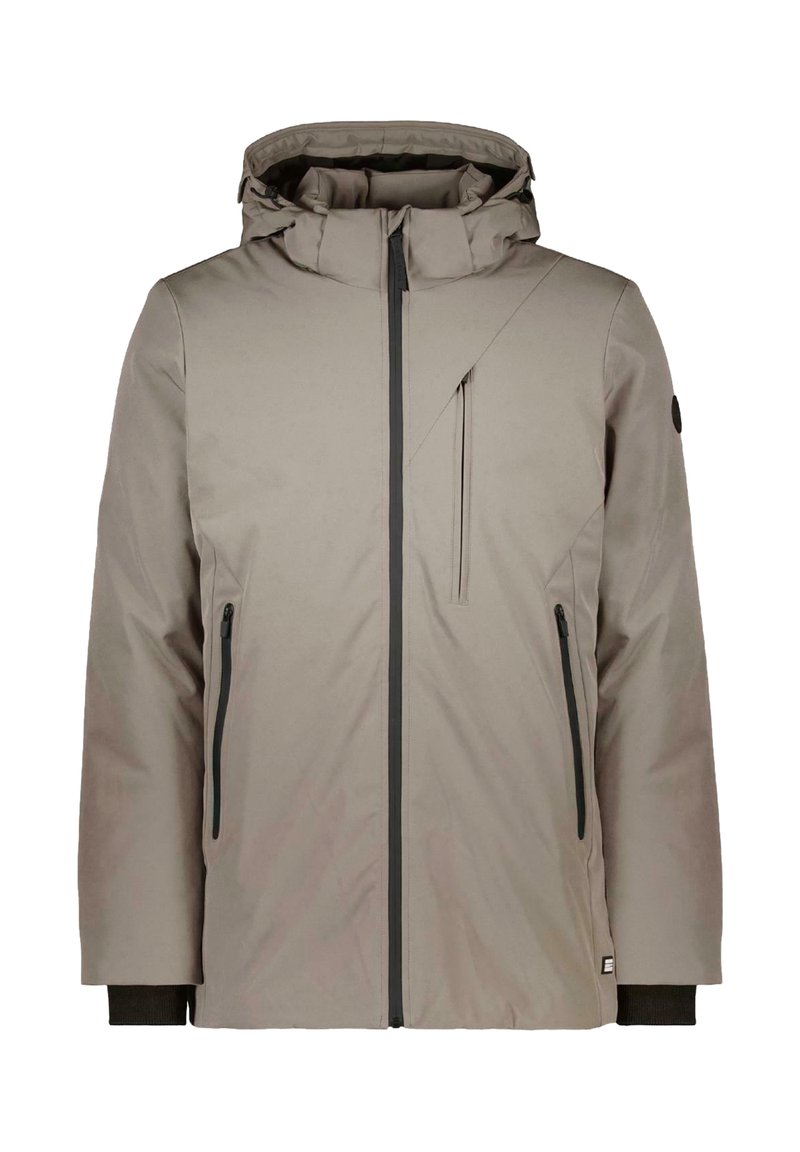 Lichtgrijze geïsoleerde jas met een capuchon, uitgerust met ritszakken, zwarte accenten, een diagonale voornaad en ribbels aan de mouwen.