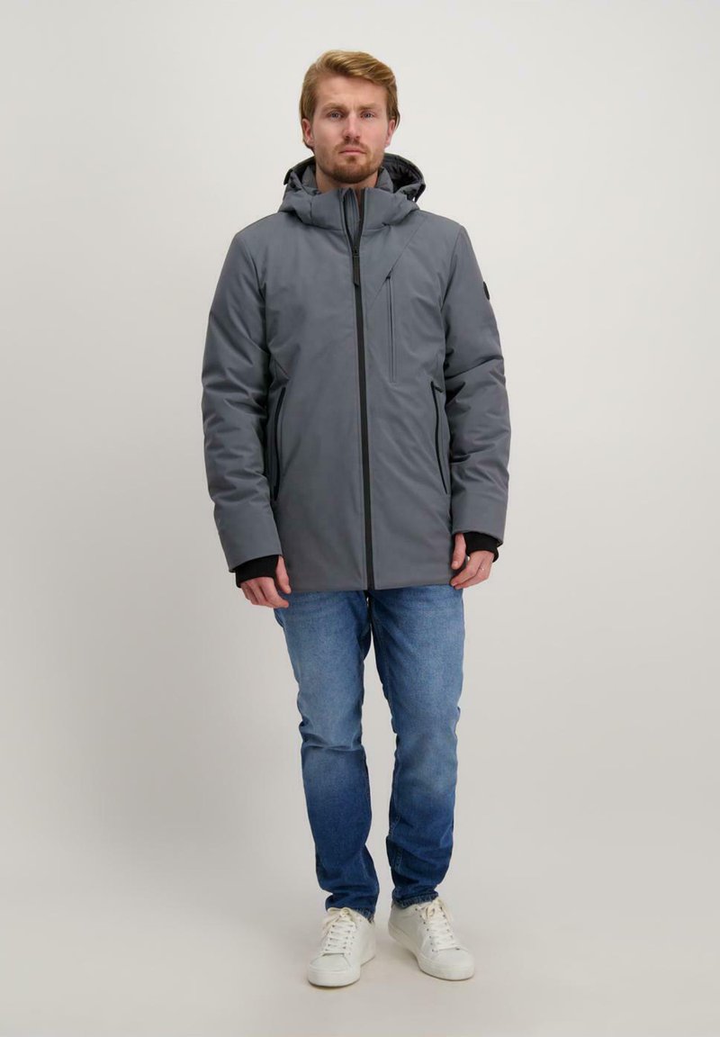 Grijze geïsoleerde jas met een capuchon, voorrits, zijzakken en zwarte accenten. Draag het over blauwe jeans en witte sneakers.