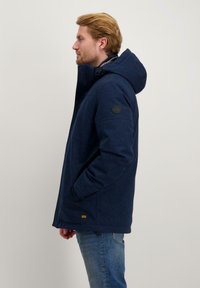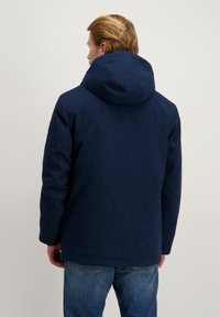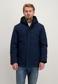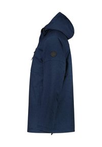 Navy blauwe hooded jack met een rits aan de voorkant, twee borstzakken en een gestructureerde stof. Voorzien van een verstelbare capuchon en contrasterende zwarte hardware.
