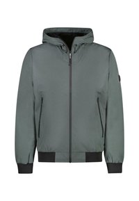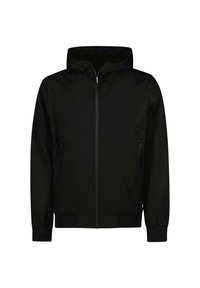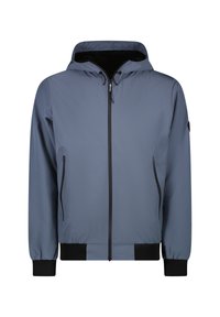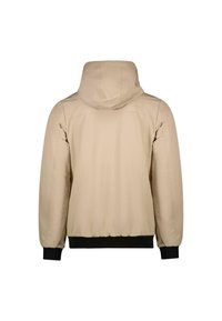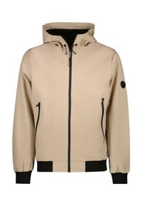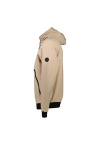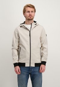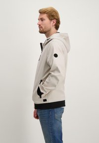 Lichtbeige zip-up jas met een capuchon, zwarte accenten, zijzakken en een gladde textuur. Gekozen over een wit shirt en een blauwe spijkerbroek.
