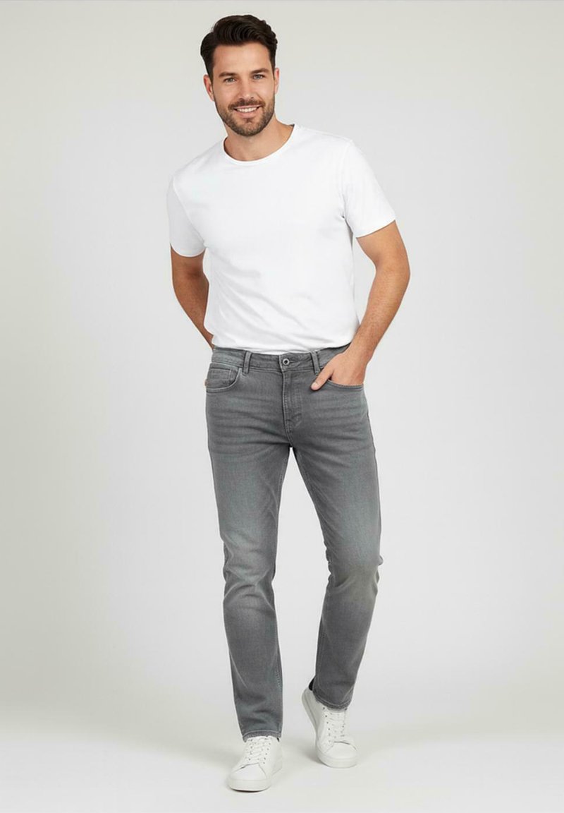 Grijze jeans met een slanke pasvorm, vijfzakkenontwerp en subtiele wassing; gecombineerd met een eenvoudige witte T-shirt met ronde hals en witte sneakers.