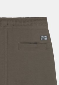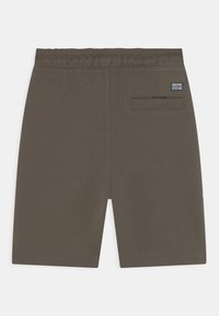 Bruine shorts met een koord in de taille, twee ritszakken aan de zijkanten met zwarte accenten en een gladde stoftextuur.