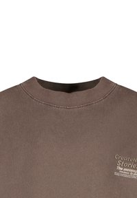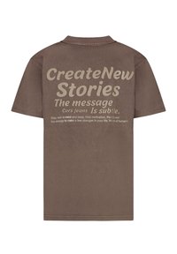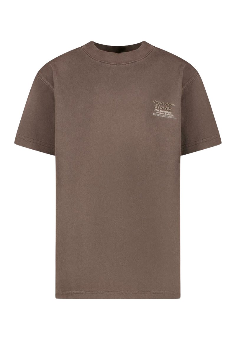 Bruine katoenen T-shirt met korte mouwen, ronde halslijn en een klein gedrukt logo aan de bovenkant aan de linkerzijde. Glad van textuur.