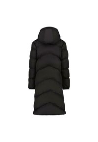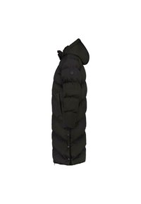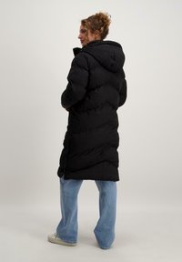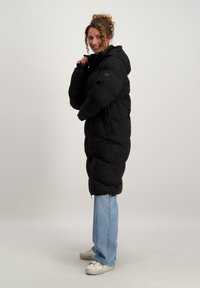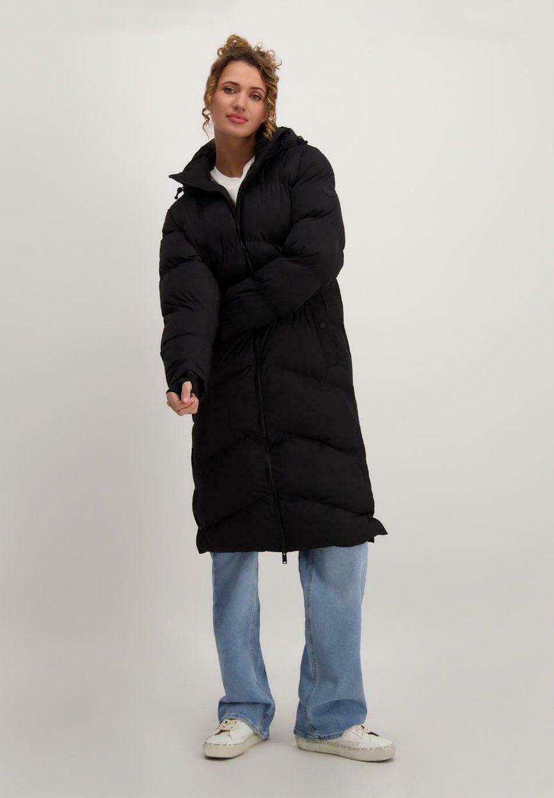 Zwarte pufferjas met een hoge kraag, lange lengte en gewatteerd design. Heeft een ritssluiting aan de voorkant en zakken, gedragen over lichtblauwe jeans en witte sneakers.