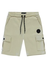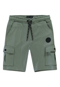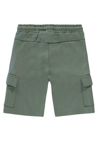 Groene cargoshorts van zacht materiaal, met een elastische tailleband, koordje, twee zijvakken en een drukknoop cargozak.