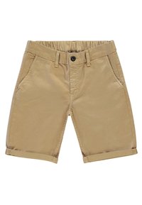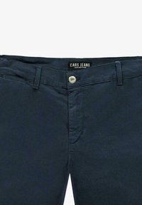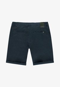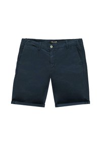 Marineblauwe katoenen shorts met een knoopsluiting aan de voorkant, riemlussen, zijzakken en opgerolde manchetten. Soepele textuur met een klassiek ontwerp.