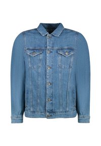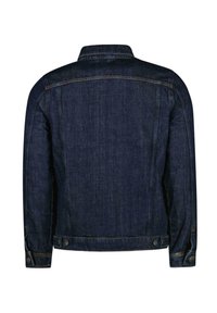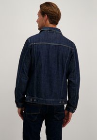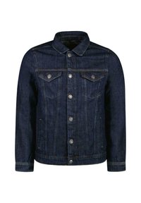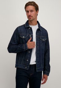 Donker denim jack met knoopsluiting aan de voorkant, twee borstzakken en een traditionele kraag. Draagt als een rechte pasvorm over een wit T-shirt.
