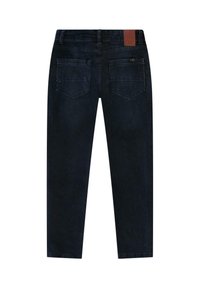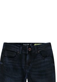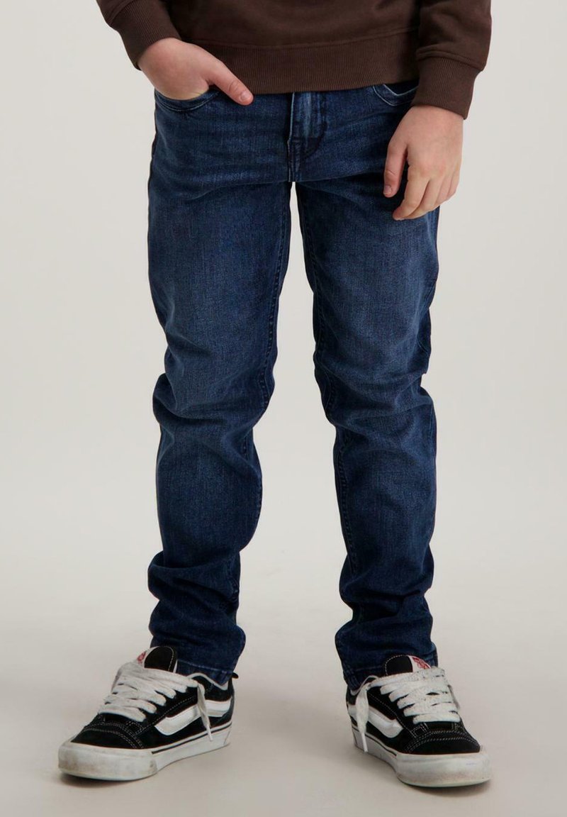 Blauwe spijkerbroek, rechte pasvorm, middelhoge taille, lichte slijtage. Draag met zwart-witte sneakers, met vetersluiting en rubberen zolen.