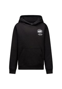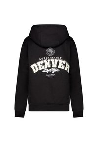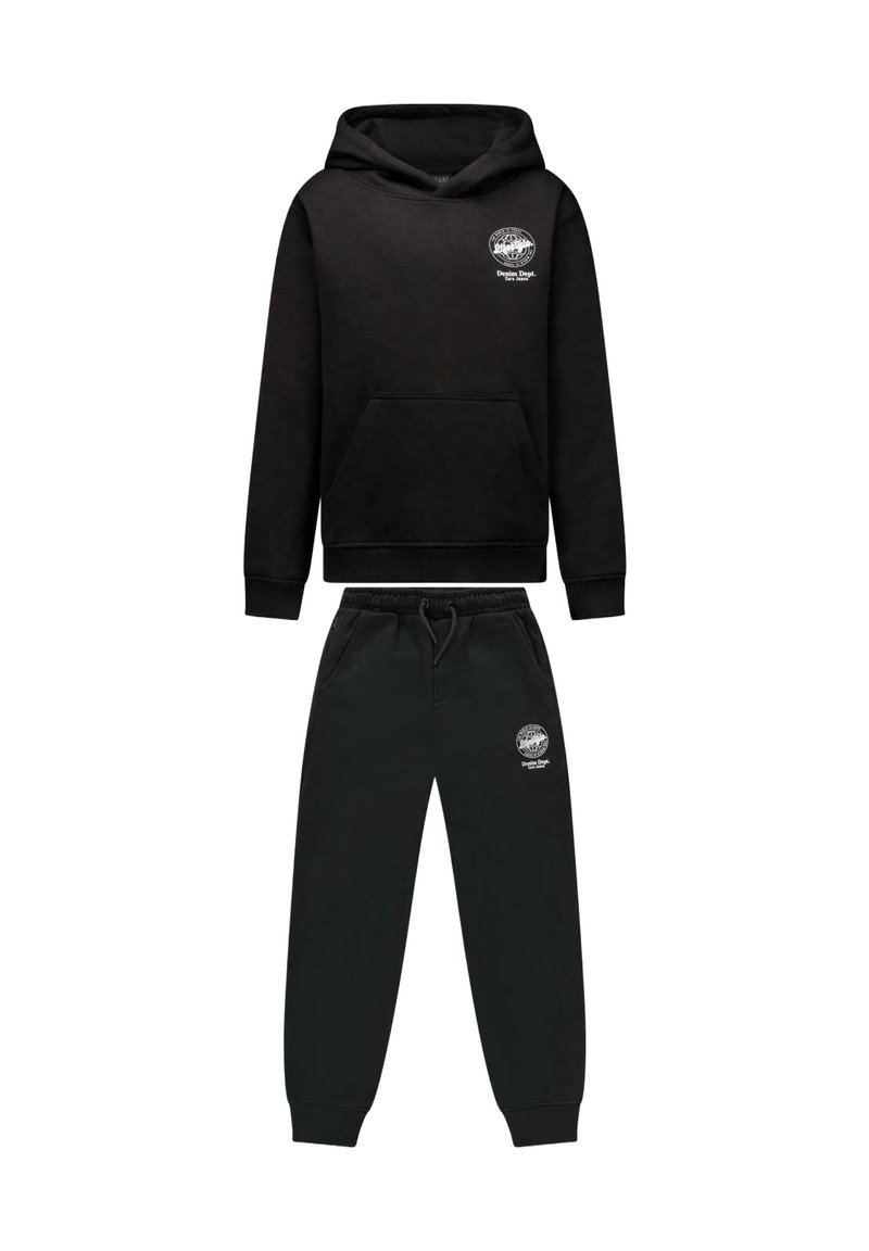 Zwarte hoodie en sweatpants set met voorzakken en een witte ronde logo op de linker borst en linker bovenbeen.
