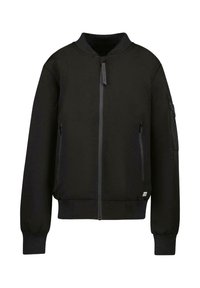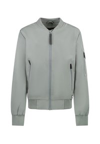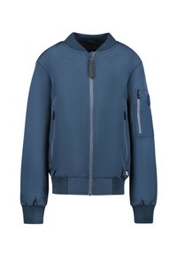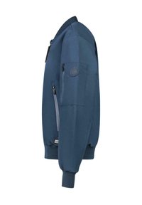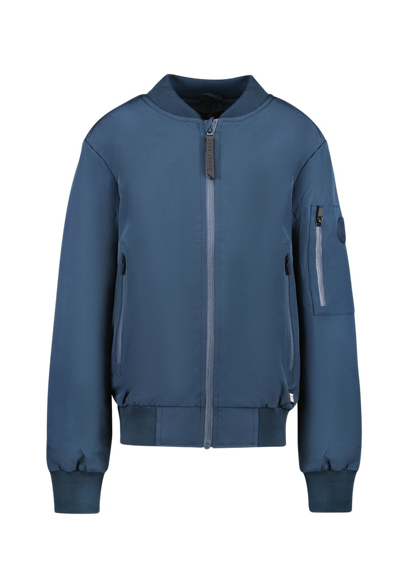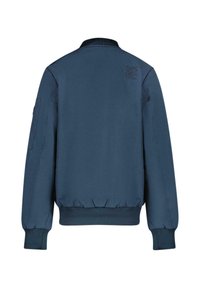 Marineblauwe bomberjack van gladde stof, voorzien van een frontrits, ribgebreide manchetten en zoom, en met ritssluiting aan de zijkanten en armen.