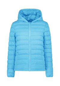 Lichtblauwe pufferjack met ritsluiting, capuchon, gestikt patroon en lange mouwen. Glad, glanzend materiaal met een gestructureerde afwerking.