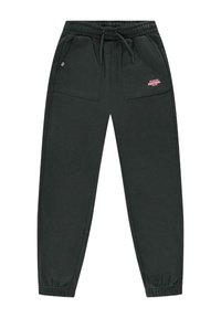 Zwarte trainingsbroeken van zacht materiaal met een elastische tailleband, verstelbaar trekkoord en twee voorzakken. Bevat een klein roze logo.