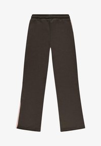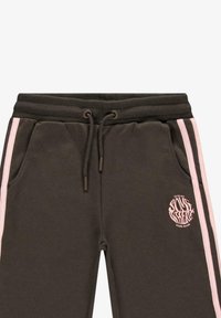 Donkerbruine sweatpants met roze zijstreepjes, een trekkoord in de taille, twee zijzakken en een logo op de linker dij. Gemaakt van zacht materiaal.