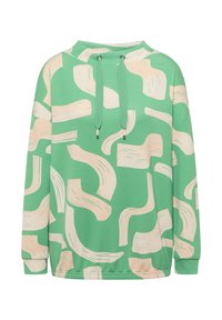 Groene hoodie met abstracte beige penseelstreekpatronen, voorzien van een capuchon met trekkoord en lange mouwen, gecombineerd met blauwe spijkerbroek.