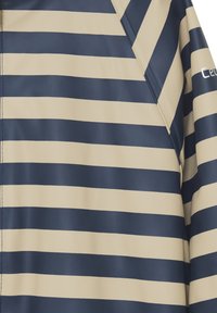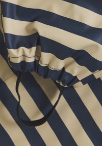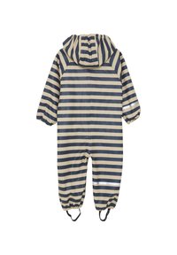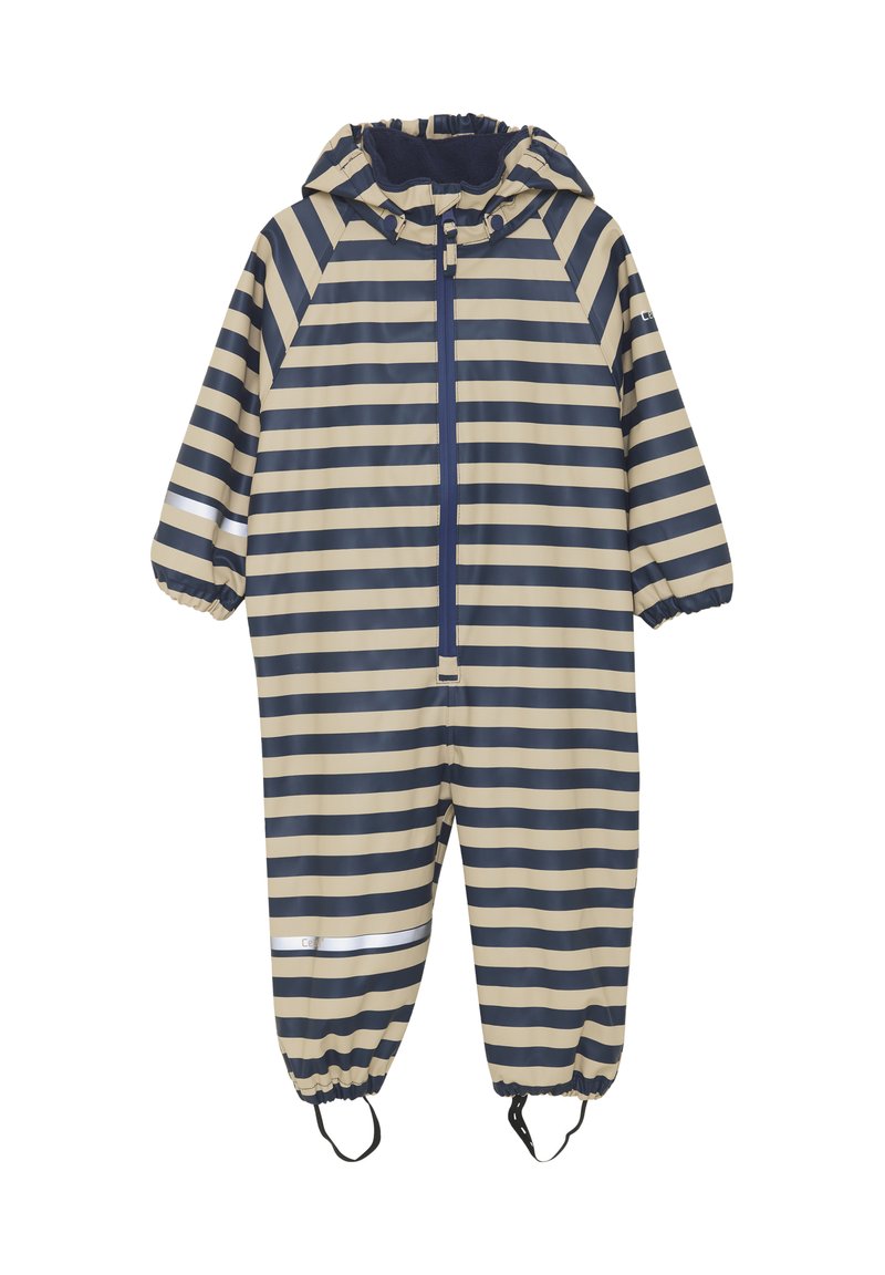 Waterdicht kinderoverall met beige en marineblauwe horizontale strepen, elastische manchetten, capuchon, ritssluiting aan de voorkant en voetbanden.