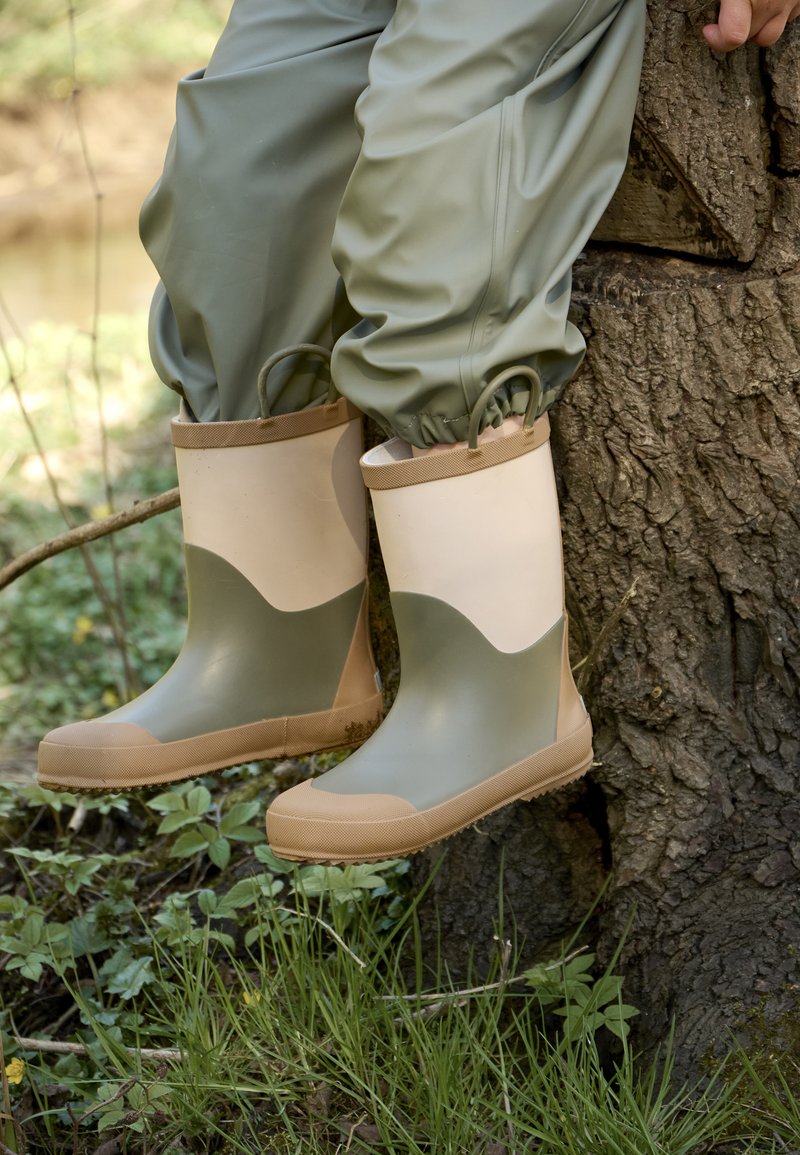 Kind draagt groene en beige waterdichte laarzen en broek, zittend op een boomstam in een grasrijke buitenomgeving.