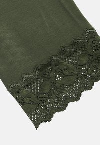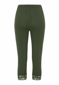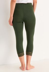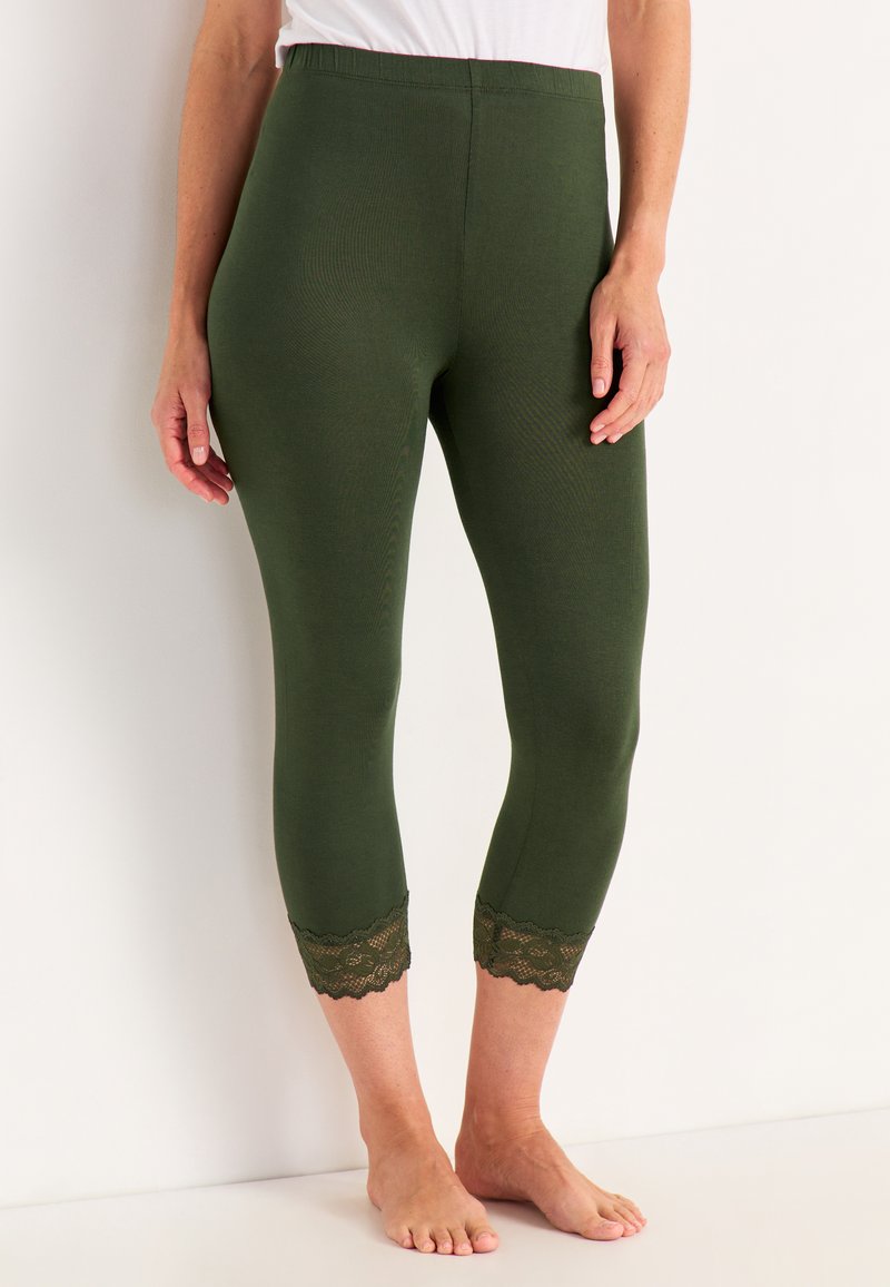 Vrouw die olijfgroene cropped leggings met kanten rand draagt, blootsvoets staand tegen een witte muur.