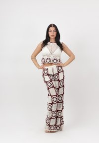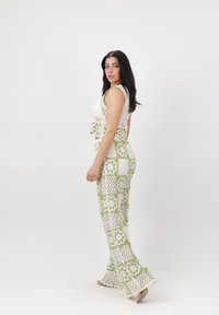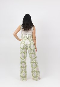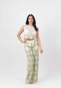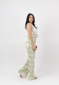 Vrouw draagt een witte en groene gehaakte crop top en broek met bloemmotieven, staand tegen een effen witte achtergrond.