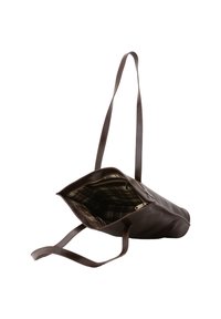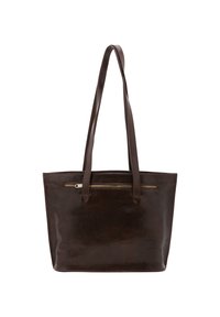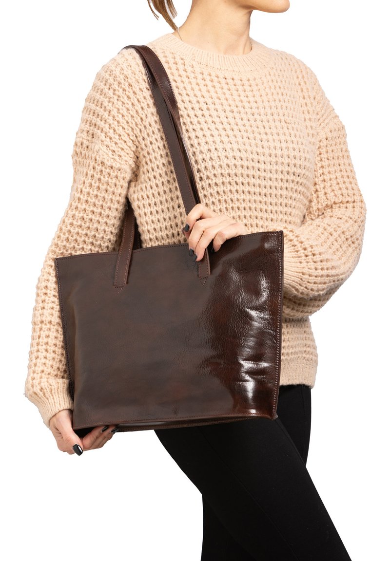 Bruine leren schoudertas met een gladde textuur, rechthoekige vorm en dubbele handvatten, vastgehouden tegen een neutrale achtergrond.