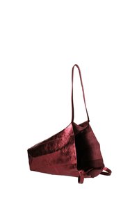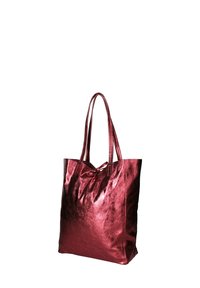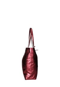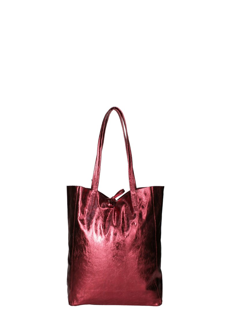 Metalen bordeauxrode tote bag met een gladde, glanzende textuur, voorzien van twee lange handvatten en een geplooide bovenkant met een strikdetail.