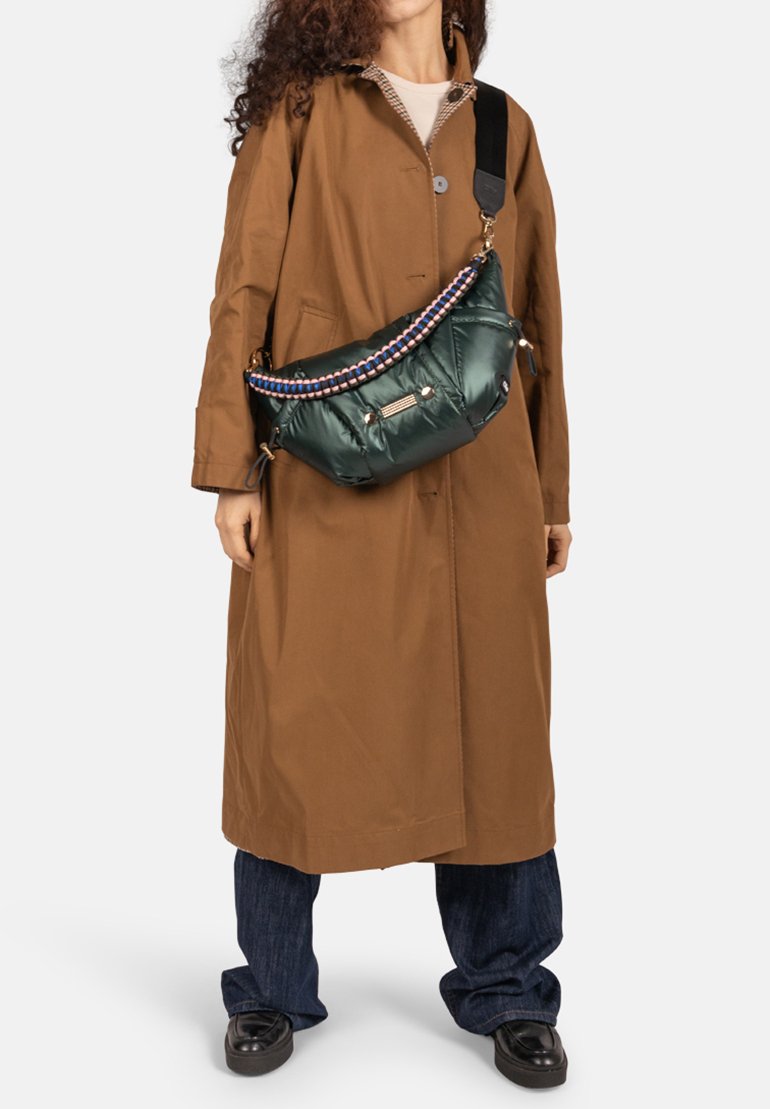 Persoon draagt een lange bruine jas, donkerblauwe spijkerbroek, zwarte schoenen en een grote donkergroene doorgestikte schoudertas met een kleurrijk bandje.