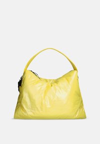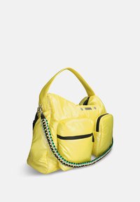 Persoon in een donker denim outfit die een grote gele, puffy schoudertas vasthoudt met voorvakken en een meerkleurige gevlochten riem.