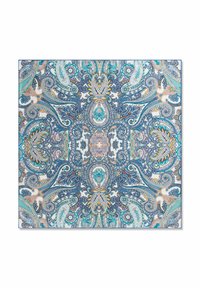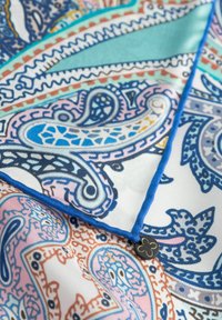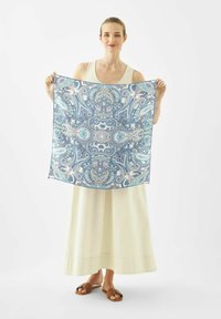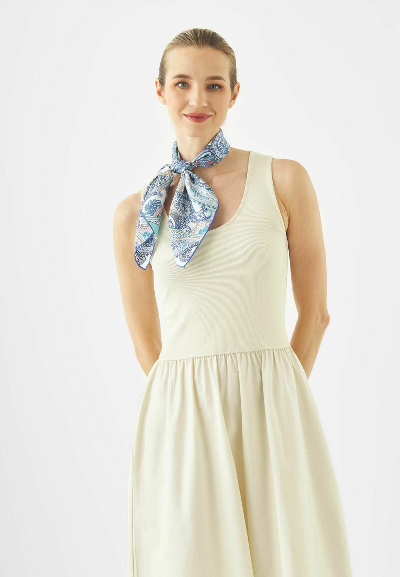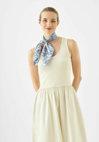 Vrouw met licht haar, gekleed in een mouwloze crèmekleurige jurk en een blauwe zijden sjaal met patroon om haar nek gebonden.