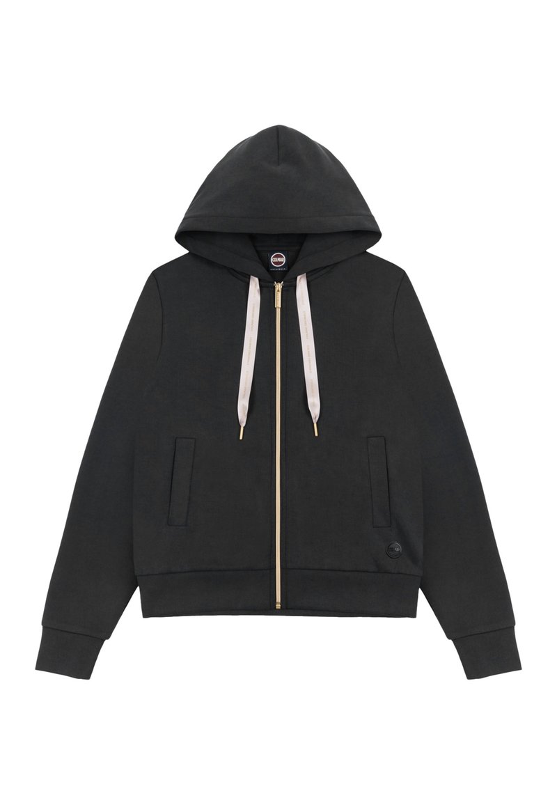Zwarte hoodie met ritssluiting, beige trekkoorden, twee steekzakken aan de voorkant, geribde manchetten en zoom, en een klein rond logo vlak bij de onderzoom.