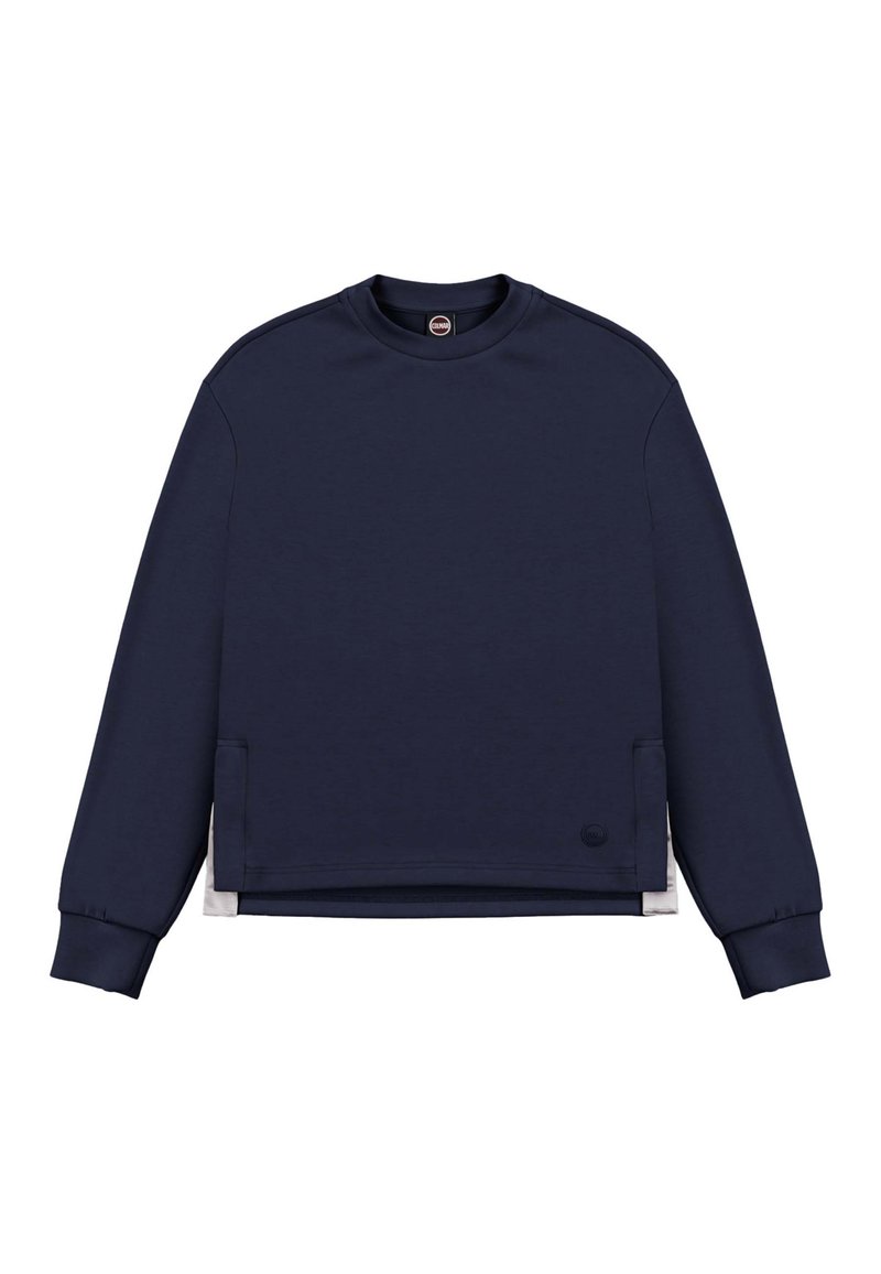 Diepblauwe longsleeve trui met ronde hals, geribbelde manchetten, zijsplitten en een klein rond logo vlak bij de zoom op een witte achtergrond.