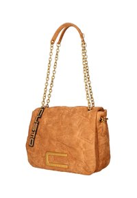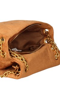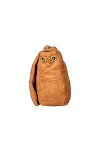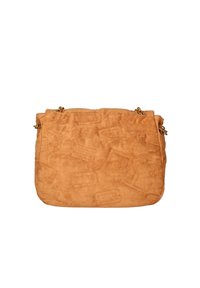 Tawny suède schoudertas met gouden kettingband, reliëflogo-patroon en een grote gouden "C"-embleem aan de voorkant.