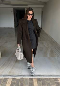 • Jonge vrouw die een kort bruine jas, een wit topje, olijfgroene broek en beige sneakers draagt, staand tegen een eenvoudige lichte achtergrond.