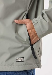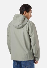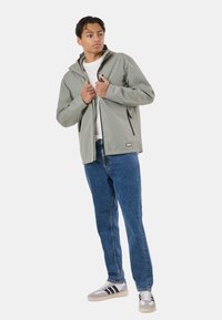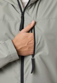 Jonge man draagt een lichtgrijze capuchonvest met rits en een blauwe spijkerbroek, kijkt iets naar links en staat voor een effen achtergrond.